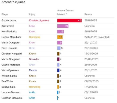 英超15轮后,阿森纳一线队的25名球员里,有17人本赛季因伤或因病缺席过至少一场比赛。且伤病集中在同一位置(如4名中卫、3名前锋缺阵),《每日电讯报》指出,阿森纳的伤病源于替补球员负荷激增、赛程密集导致训练不足、战术对爆发力的依赖等,也存在比赛意外因素。